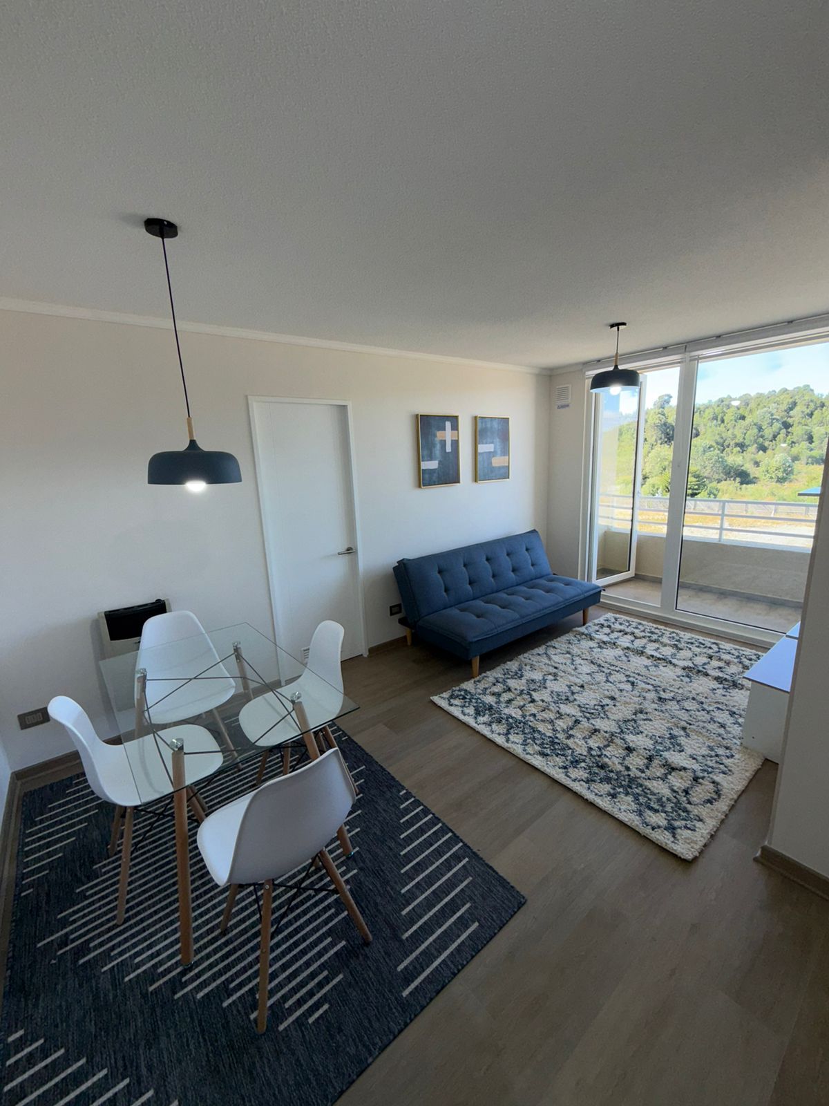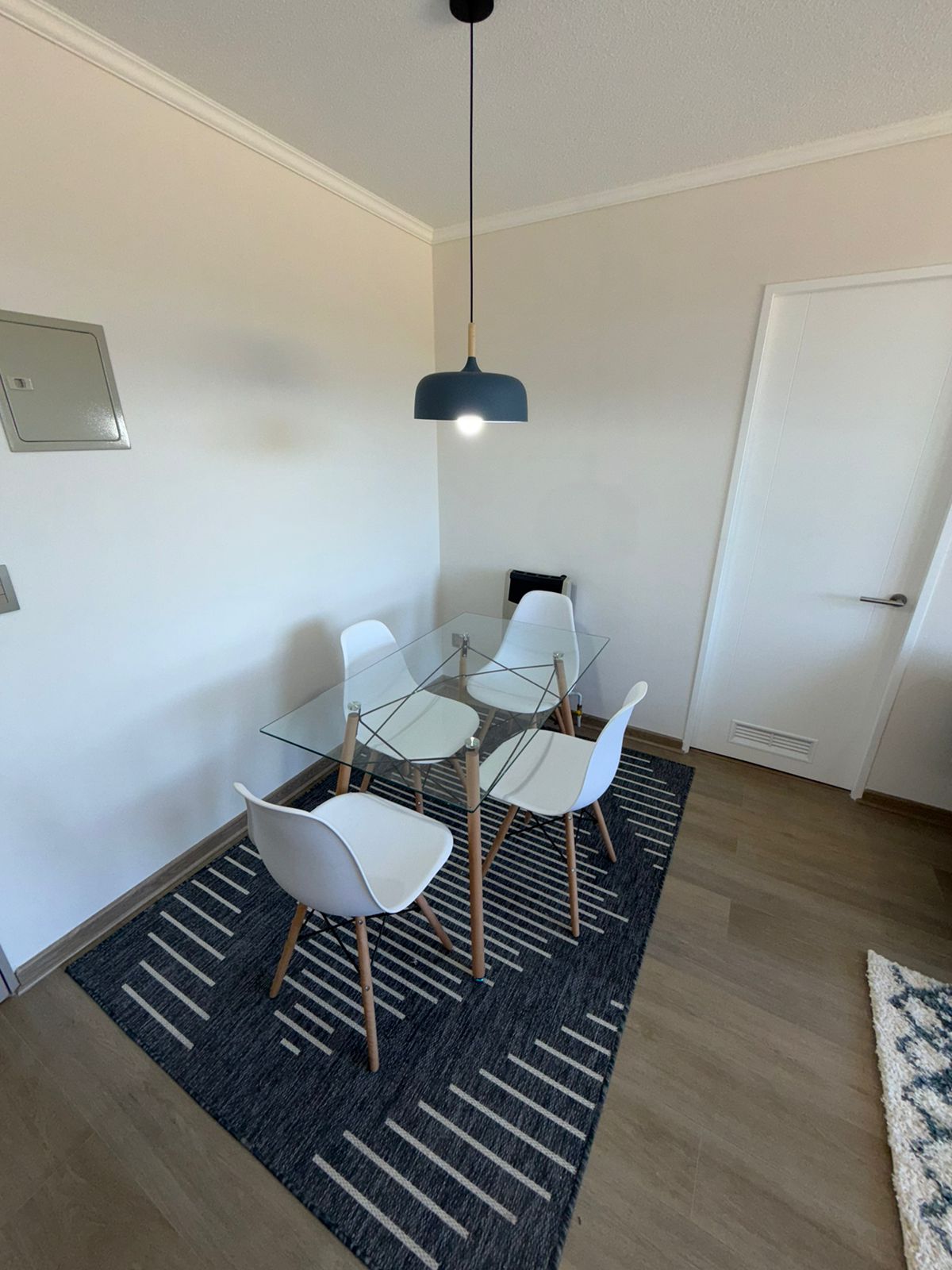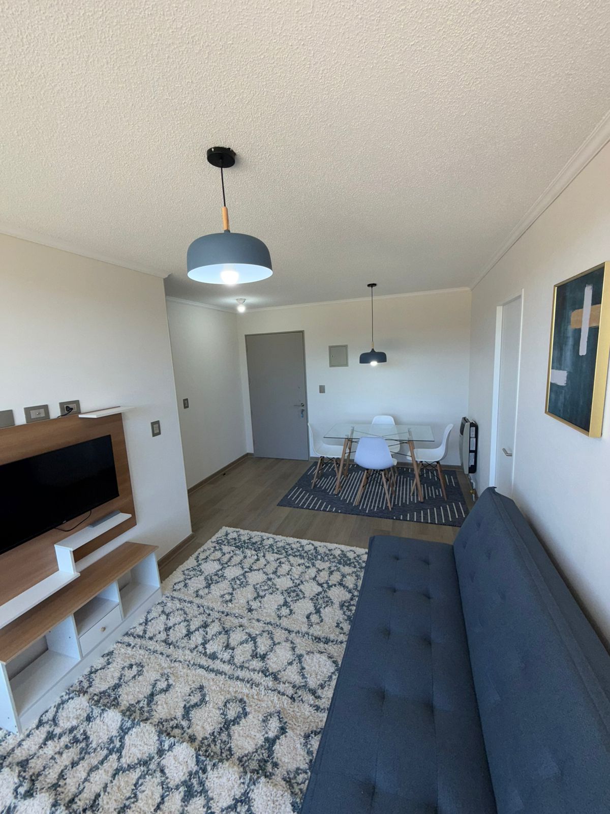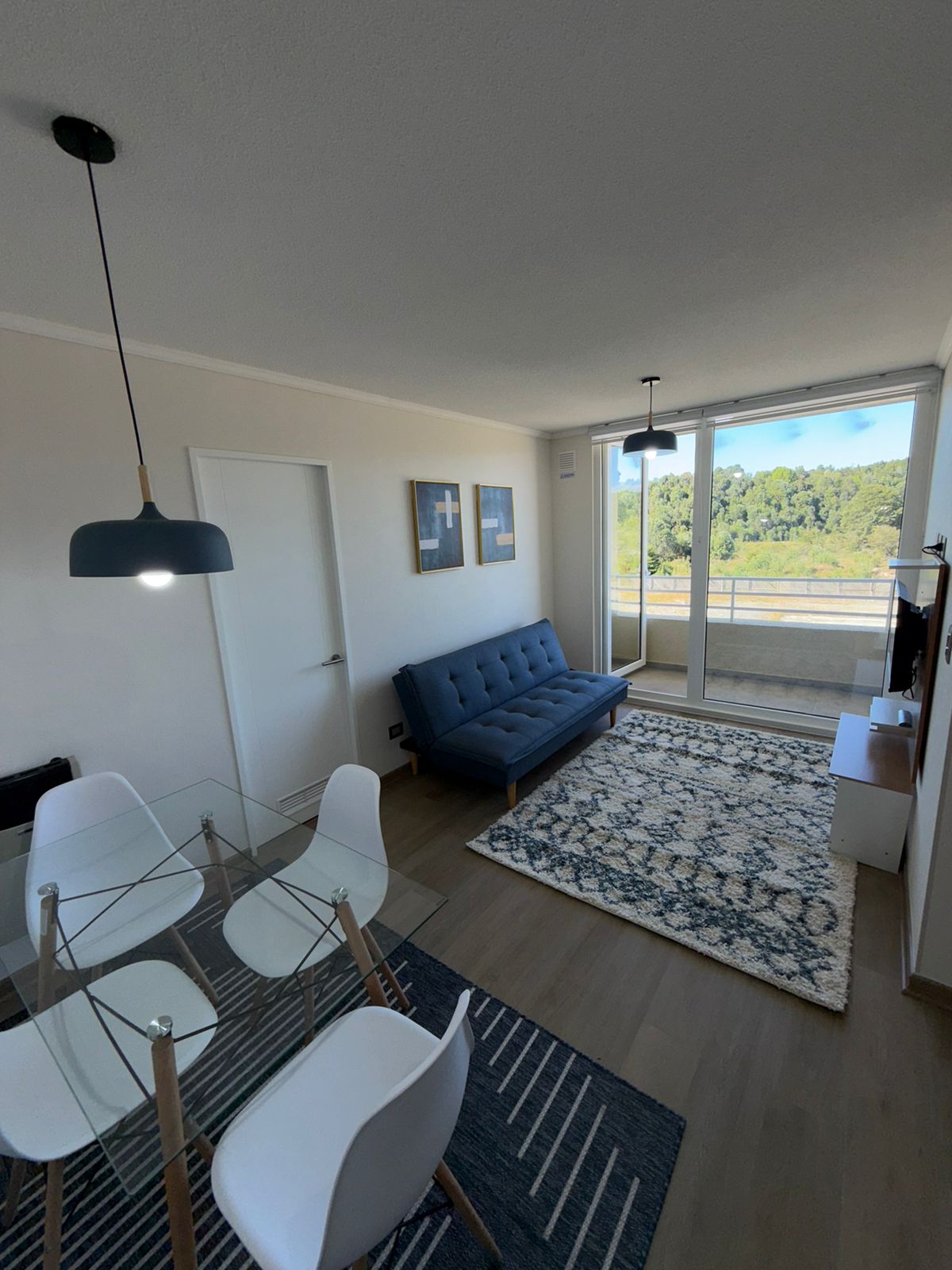 🛋️ Living-Comedor: Amoblado con futón, TV instalada, mesa de comedor con 4 sillas, alfombras decorativas, cortinas roller y lámparas de diseño.
